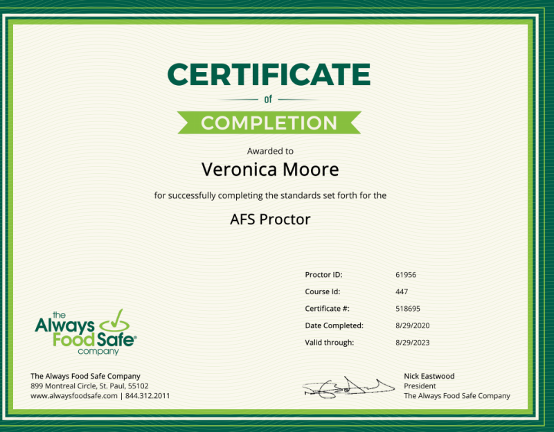 Earn your food Safety Management Certification with Ansi ACCREDITED company. Remote training and testing. Train in the comfort of your own home, and on your own device. After completion of courses, Veronica Moore, Certified Instructor and Proctor, will come to your home, business, or place of choice for testing. You have two (2) attempts covered in your one payment option. You will receive your certification as soon as you pass. Now at a special fee of $175! This includes the purchase of your online courses+ exam + Proctor fee.